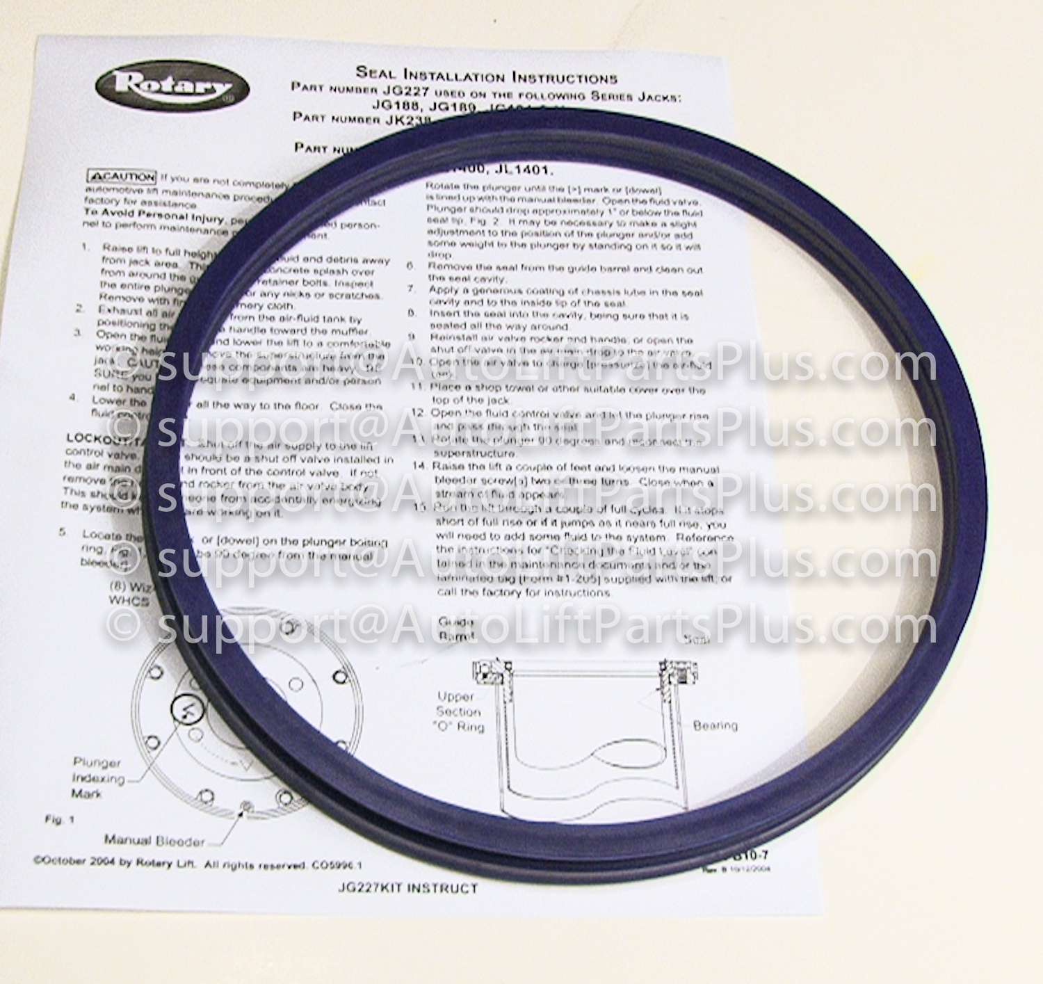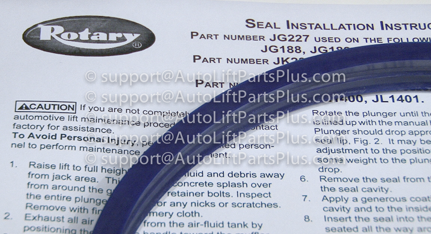 This listing is for (ONE) Original Equipment seal kit (JG227KIT) for Rotary In-Ground Low-pressure lifts with 8 1/2″ diameter pistons. This seal was used on the last style Rotary introduced in 1988 before they discontinued low-pressure, high-volume in-ground lifts, on the automotive side, in the 1990s.